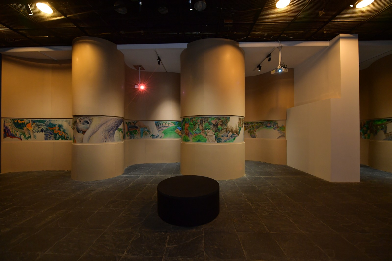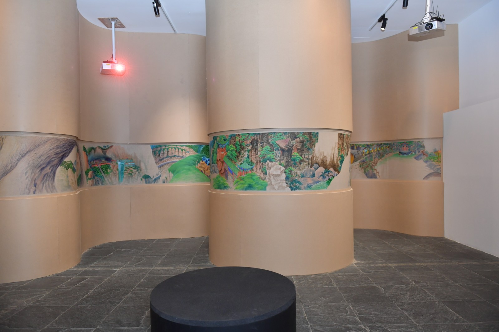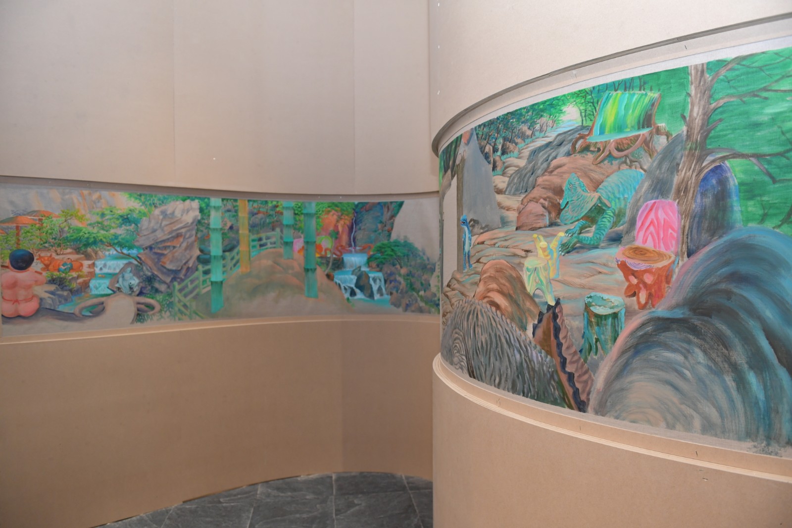 “地洞”一旁是展廳的下沉區(qū)域,這里被策展人設(shè)計(jì)為去往“桃花源”的實(shí)體路徑。梁碩的《景了個(gè)區(qū)》出現(xiàn)在這個(gè)下沉空間的一排四個(gè)口袋式的連續(xù)隔間墻面上,從空間上來(lái)說(shuō)是無(wú)比契合的。回顧梁碩2019年在北京公社的展覽《梁碩:景區(qū)》同樣可以見(jiàn)到這樣一種迂回的觀展路徑?!熬皡^(qū)”這個(gè)概念的提出,在藝術(shù)家看來(lái)代表著今天人們對(duì)山水的理解,這個(gè)獨(dú)特的概念跨越了自然景觀與都市空間。梁碩在自己撰文的《景了個(gè)區(qū)》中復(fù)原了一個(gè)景區(qū)籌備建立起來(lái)的小故事,承包景區(qū)改造的劉工在工期接近尾聲時(shí),看到自己的“杰作”時(shí)不由感嘆:“這些水泥造物,居然都妥妥的在那了,像是本來(lái)就是從山里長(zhǎng)出來(lái)的,那巨大的假山石和假樹(shù)根顯得造型怪異,卻頗得陳老蓮氣韻,在落日的余暉中與真山融為一體,真山也像了假山……”[6]景區(qū)的建立勢(shì)必意味著人工、商業(yè)、消費(fèi)對(duì)自然景觀的直接侵入與改造,空間、審美、意識(shí)形態(tài)等一系列問(wèn)題由此發(fā)生。
