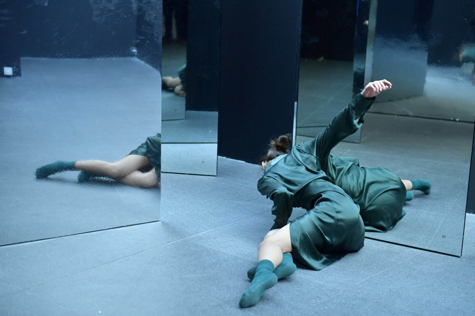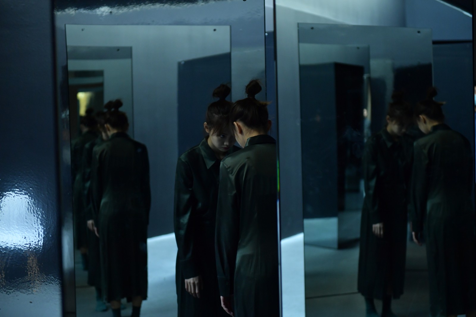 在OCAT研究中心展廳最明亮而寬闊的長(zhǎng)走廊上,紙老虎工作室借助六個(gè)鏡面反射的三棱柱營(yíng)造了一個(gè)劇場(chǎng)式的空間,邀請(qǐng)觀眾進(jìn)入并參與到劇目的演繹與發(fā)展中來(lái)。鏡面反射著“我”和周?chē)沫h(huán)境,清晰地呈現(xiàn)著“我”在環(huán)境中的位置。
