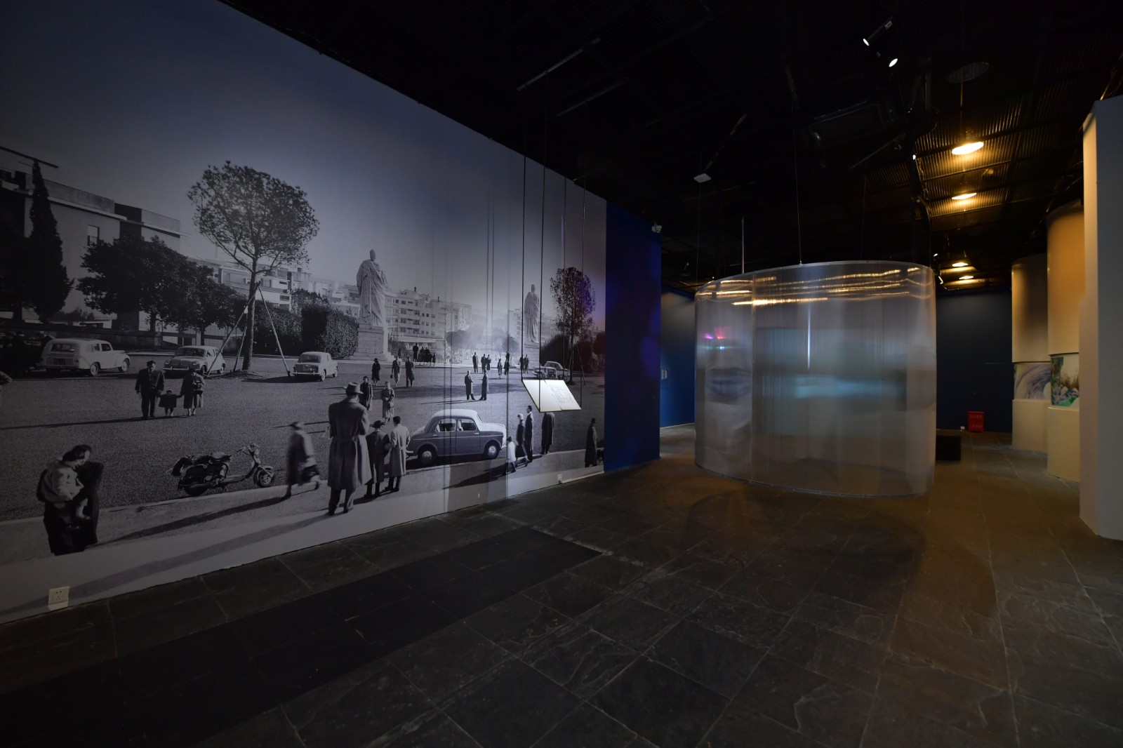 臺(tái)階的最上方引導(dǎo)著觀眾走向迷宮的“出口”——那是一個(gè)陽(yáng)臺(tái),它被認(rèn)為跨越了私人領(lǐng)域和公共領(lǐng)域之間的那條不甚明晰的界限。人們?cè)诘巧详?yáng)臺(tái)的那一瞬間,目之所及的是胡偉呈現(xiàn)的“廣場(chǎng)”。在《為公共口口(邂逅),提案》中,胡偉對(duì)自己家鄉(xiāng)的廣場(chǎng)進(jìn)行了調(diào)研,廣場(chǎng)中心紀(jì)念碑雕塑的拆除背后是對(duì)一段宏觀歷史的回顧,展柜中陳列的文獻(xiàn)材料,3D打印復(fù)原的紀(jì)念碑與噴泉,都以一種最傳統(tǒng)的方式印證著這段歷史的發(fā)生與存在。而在面向陽(yáng)臺(tái)的視頻圖像語(yǔ)境中,胡偉通過(guò)鏡頭的聚焦切換與角度變化,在宏觀的歷史背景外,其似乎在試圖提煉除一種模糊的普遍性,其適用于廣泛的公共空間與集體記憶,卻與人們的個(gè)體記憶都有不謀而合之處,但又難以捕捉,“沒(méi)有面目,也無(wú)人認(rèn)領(lǐng)”。