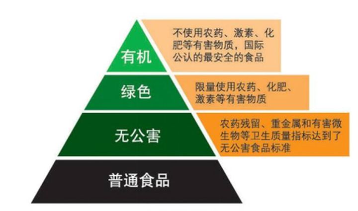 我國對農(nóng)產(chǎn)品的安全分類,包括有機、綠色、無公害三個等級。分別指對化肥、農(nóng)藥、激素、轉(zhuǎn)基因使用的不同要求。先看一張圖: