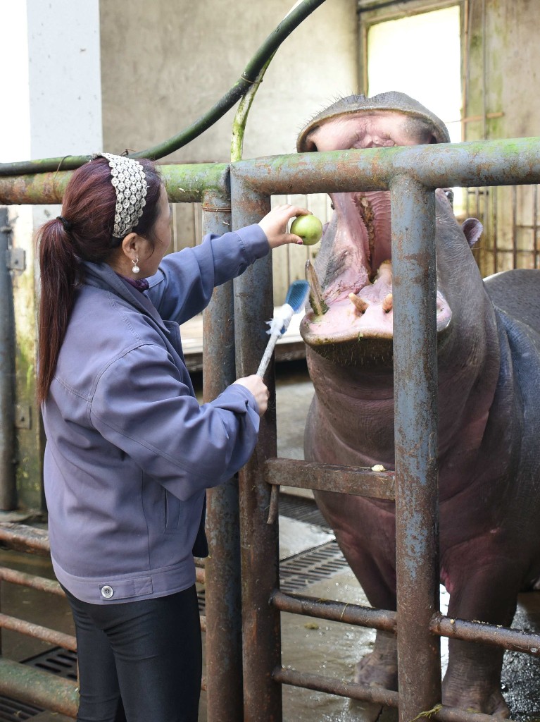 對于成年河馬除了身高體重測量,還要多加一項口腔檢查??纯茨菑堦懮溉閯游镏凶畲蟮淖炖?,口腔、牙齒是否健康。為更好觀察細節(jié)會先給河馬刷牙,河馬們對這種健康又舒適的特殊服務十分歡迎。