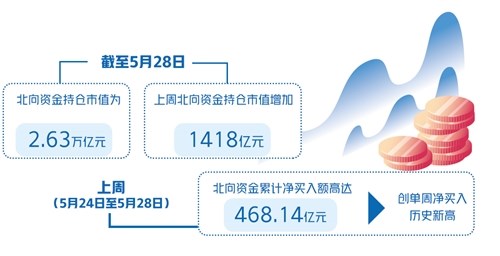 具體看,截至5月28日,北向資金持倉市值為2.63萬億元,上周北向資金持倉市值增加1418億元。