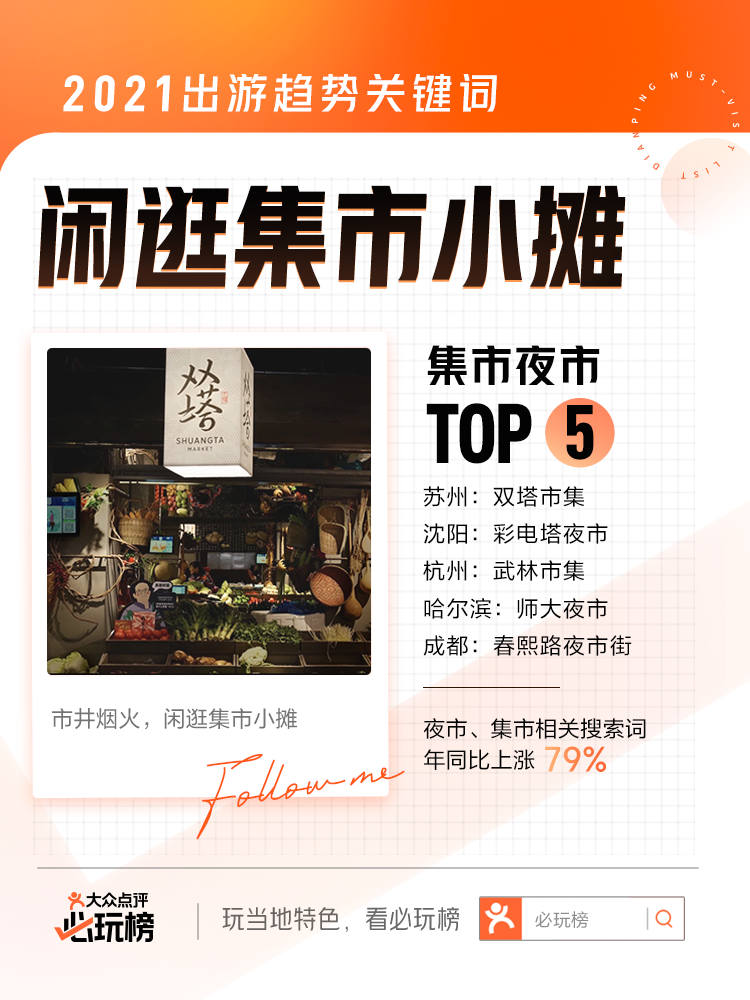 “市井煙火氣,最撫凡人心”,夜市、集市拓寬游客游玩半徑,為深度探索城市提供了更多可能。據“必玩榜”數據顯示,夜市、集市相關搜索詞年同比上漲79%,其中哈爾濱的師大夜市與蘇州的雙塔市集、沈陽的彩電塔夜市、杭州的武林市集、成都的春熙路夜市街共同入選全國TOP5熱門集市夜市。