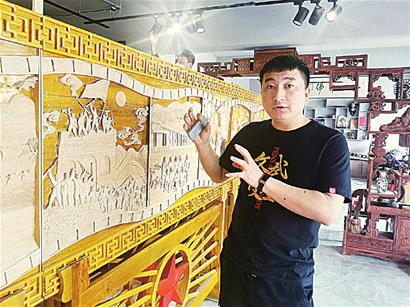 近年來(lái),李寶峰大膽嘗試,在傳統(tǒng)木雕作品的基礎(chǔ)上不斷創(chuàng)新,懷著對(duì)黨的感恩和對(duì)家鄉(xiāng)的熱愛(ài),不斷將作品注入紅色元素,積極探索設(shè)計(jì)創(chuàng)作具有時(shí)代氣息的木雕作品,用刀木刻畫(huà)春秋、記錄時(shí)代變遷。