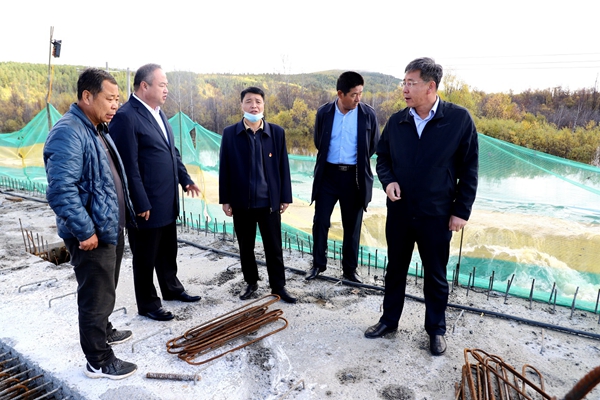 林業(yè)局黨委副書記、局長韓鳳泉(右一)深入在建楚龍溝大橋現(xiàn)場(chǎng)落實(shí)泄洪措施,確保國道G111安全。