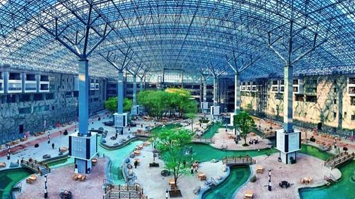 五大連池火山溫泉水世界是黑龍江省北部最大的室內(nèi)水上娛樂項目,總占地面積15.2萬㎡?;鹕綔厝澜缡且詼厝B(yǎng)生文化為主題,以火山為主要元素的園林式水上樂園。對游樂設(shè)施進行文化植入、主題化包裝,建成集特色溫泉水上游樂、餐飲娛樂、休閑購物和旅游觀光于一體的室內(nèi)水上娛樂及溫泉養(yǎng)生綜合體。