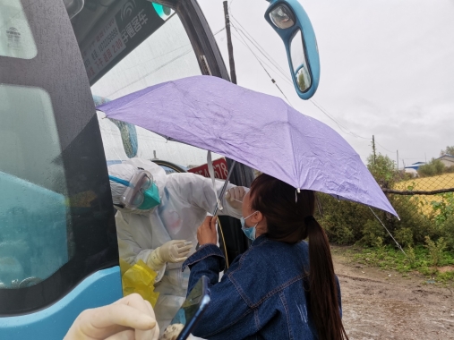 省醫(yī)院南崗院區(qū)中心手術室護士趙明裕,中秋節(jié)當天下午正在家中給八歲的大女兒過生日,接到通知需要支援巴彥縣核酸采集,親了親身邊的大女兒和四歲的小女兒,立即驅車前往醫(yī)院。到達巴彥后,趙明裕被分到后山鄉(xiāng),三人小組同組另兩位隊員都是年過40歲的大姐,已經是預備黨員的趙明裕想想自己年輕一定要多干些,主動請纓承擔了更多的工作。當天,三人共完成了五個村屯近600人的采集,外面陰雨綿綿,氣溫驟降,手消涂在手套上,全手掌冰涼的感覺讓趙明裕本就著裝不多的身體愈發(fā)冰冷,但想到臨行前醫(yī)院同事一次次的叮嚀與囑托,她心中堅信,抗疫必勝。同時當?shù)卮迕竦臒崆橐沧屭w明裕的心里暖暖的,后山鄉(xiāng)政府的工作人員和人民群眾都非常積極的配合,尤其是老人和小孩,并沒有由于天氣陰雨綿綿的原因而不配合,都在鄉(xiāng)領導的指揮下,井然有序的配合著。