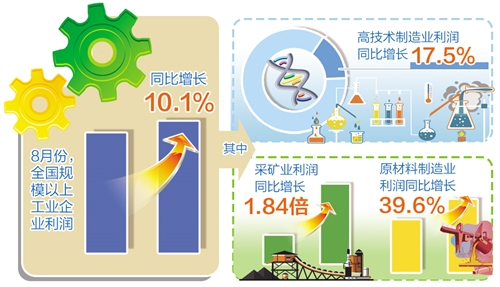 從1月份至8月份累計看,41個工業(yè)大類行業(yè)中,37個行業(yè)利潤總額同比增長,1個行業(yè)扭虧為盈,1個行業(yè)持平,2個行業(yè)下降。其中,石油、煤炭及其他燃料加工業(yè)利潤總額同比增長24.71倍,石油和天然氣開采業(yè)增長2.65倍,有色金屬冶煉和壓延加工業(yè)增長1.78倍,黑色金屬冶煉和壓延加工業(yè)增長1.56倍,化學(xué)原料和化學(xué)制品制造業(yè)增長1.45倍,煤炭開采和洗選業(yè)增長1.45倍。