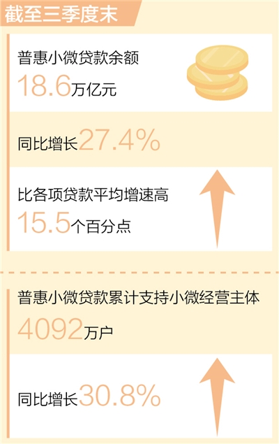 中國人民銀行發(fā)布的最新數(shù)據(jù)顯示,截至三季度末,我國普惠小微貸款余額18.6萬億元,同比增長27.4%,比各項貸款平均增速高15.5個百分點。普惠小微貸款維持較高的增長態(tài)勢,繼續(xù)保持量增、面擴、價降、結(jié)構(gòu)優(yōu)化的特點。