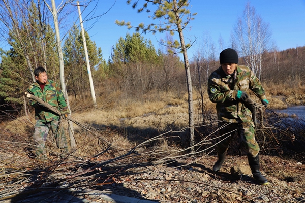 圖為阿木爾林業(yè)局防火辦黨總支黨員突擊隊帶領專業(yè)撲火隊員在修剪北極植物園樹枝(王力/攝)