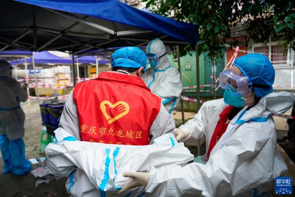 11月4日,在重慶九龍坡區(qū)九龍街道,青年志愿者相互幫助穿防護(hù)服。