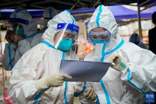 11月4日,在重慶九龍坡區(qū)九龍街道,兩名身穿防護(hù)服的青年志愿者準(zhǔn)備入戶核對(duì)信息。