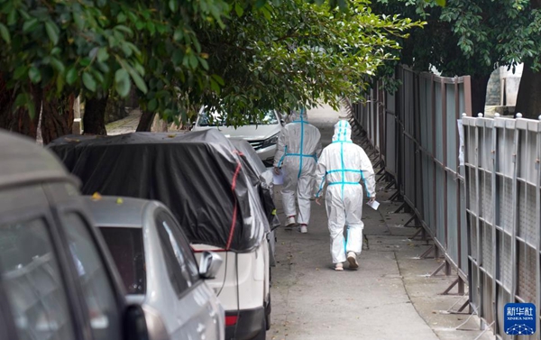 11月4日,在重慶九龍坡區(qū)九龍街道,兩名身穿防護(hù)服的青年志愿者走向自己負(fù)責(zé)的樓棟。