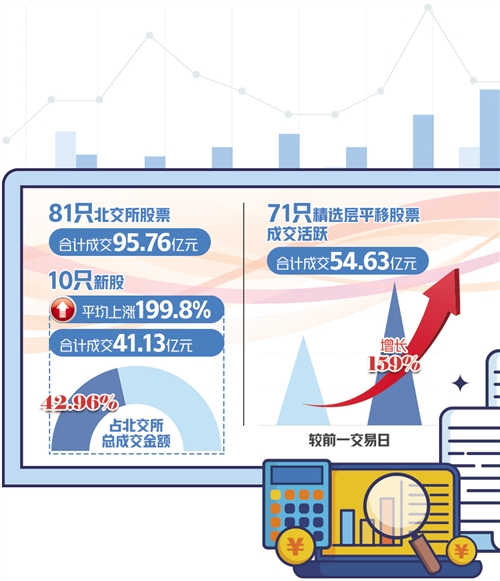 北交所首個(gè)交易日運(yùn)行平穩(wěn),81只股票合計(jì)成交95.76億元。首批上市交易的10只新股全線上揚(yáng),盤中均觸發(fā)兩次臨時(shí)停牌。截至收盤,10只新股平均較發(fā)行價(jià)上漲199.80%。71只從精選層平移至北交所的股票漲跌互現(xiàn)。