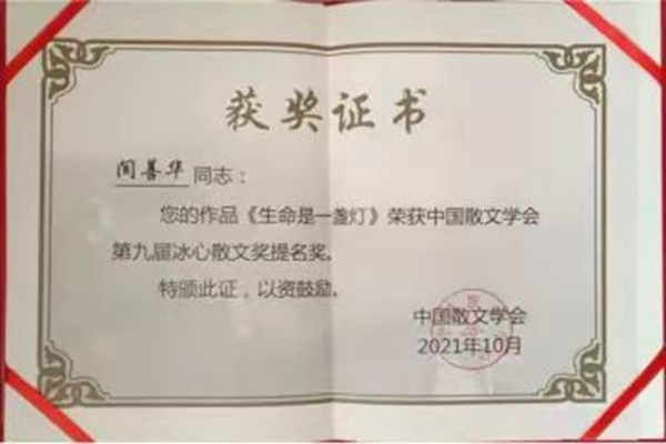 在幾十年的文學創(chuàng)作和編輯工作中,她不斷堅持學習提高,筆耕不輟,執(zhí)著堅守。在2020年10月發(fā)表在《北極光》上的散文《生命是一盞燈》,因主題對生命的感悟,用縱橫寬泛的思路、真摯的情感,流暢的文筆,經(jīng)評委嚴格評審,最終脫穎而出,獲得本屆冰心散文獎單篇提名獎。這對于一直深居邊陲縣城的一名作家,能邁進冰心散文獎這中國散文最高獎的大門,是一個非常難得的殊榮。