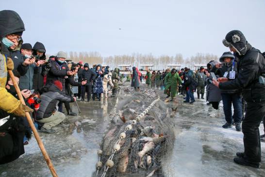 另外,杜爾伯特連環(huán)湖水產(chǎn)資源豐富,水產(chǎn)養(yǎng)殖業(yè)水域面積56萬多畝,湖內(nèi)盛產(chǎn)40種淡水魚類,尤以鯉魚、草魚、鰱魚、胖頭魚、鯽魚、黑魚等為多,年捕魚千余噸,冬網(wǎng)捕魚更是傳統(tǒng)習(xí)俗。連環(huán)湖溫泉景區(qū)冬季每天上午免費(fèi)開展民俗冬捕活動(dòng),購魚享受8折優(yōu)惠,還可以參與抽獎(jiǎng)活動(dòng)。