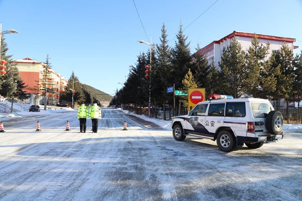 阿木爾公安分局交警對(duì)藍(lán)莓小鎮(zhèn)實(shí)施交通管制(王力 攝)