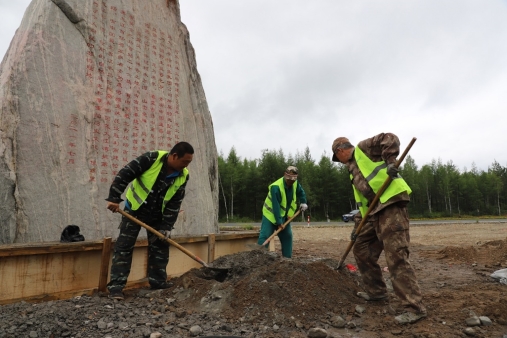 阿木爾林業(yè)局環(huán)衛(wèi)隊黨員干部職工為林業(yè)局在西出口路新建的地標打地基(王力 攝)