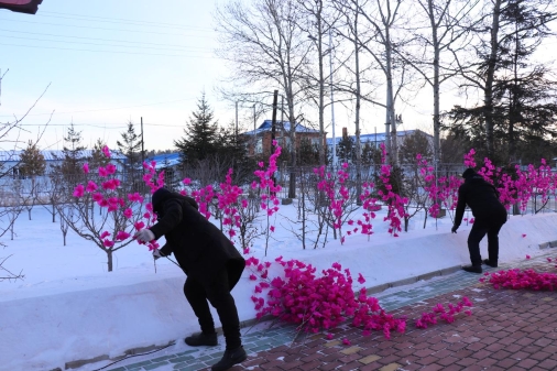 林場以“齊抓共管美環(huán)境、高高興興過大年”為定位,組織職工對辦公區(qū)域進行了全方位大掃除,不放過清潔區(qū)的任何一個衛(wèi)生死角。通過換旗幟、砌雪墻、掛彩燈、制作了手工插花等多種形式,開展了環(huán)境美化亮化活動,給冬日的場區(qū)打造了一道靚麗的風景線。