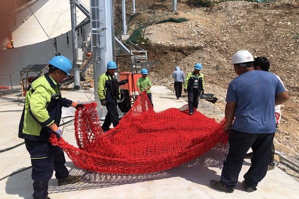 阿木爾林業(yè)局產(chǎn)業(yè)職工楊輝(左一)與其他職工在國家跳臺中心安裝防護(hù)網(wǎng)。