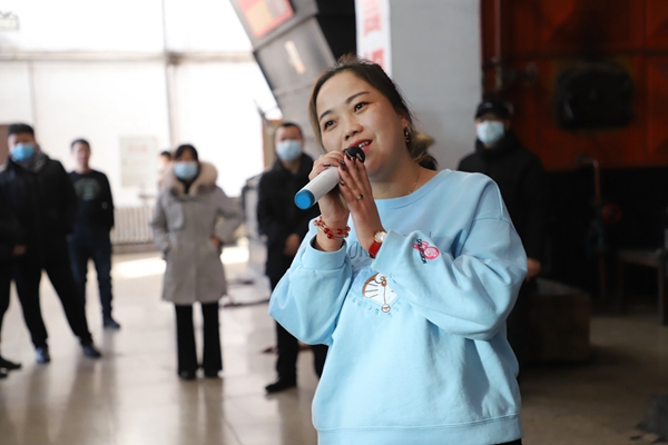 阿木爾林業(yè)局文藝輕騎兵小分隊(duì)隊(duì)員張春雨為物業(yè)公司集中供熱一車間司爐工演唱歌曲《又見山里紅》(王力 攝)