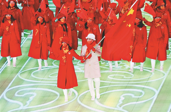 中國代表團(tuán)旗手高亭宇(右)。 新華社記者 徐子鑒攝