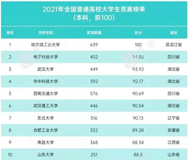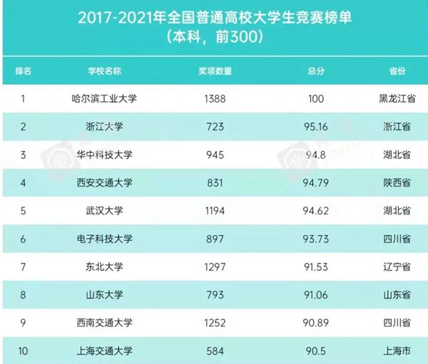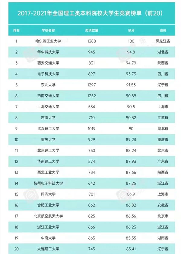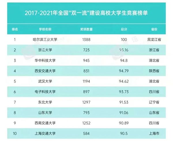 黑龍江經濟網訊(黑龍江日報全媒體見習記者董廣碩 商祺)近日,中國高等教育學會高校競賽評估與管理體系研究工作組發(fā)布2021全國普通高校大學生競賽分析報告,全國共有1197所本科院校進入2017—2021年本科榜單。哈爾濱工業(yè)大學以獲獎數量1388項、總分100分獲得2017—2021年全國普通高校大學生競賽榜單榜首,以獲獎數量639項、總分100分獲得2021年全國普通高校大學生競賽榜單榜首。這是哈爾濱工業(yè)大學連續(xù)3次獲得上述榜單冠軍。