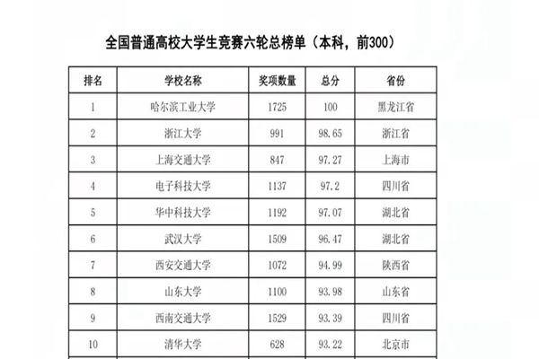哈爾濱工業(yè)大學以獲獎數量1725項、總分100分的絕對優(yōu)勢獲得全國普通高校大學生競賽六輪總榜單冠軍。