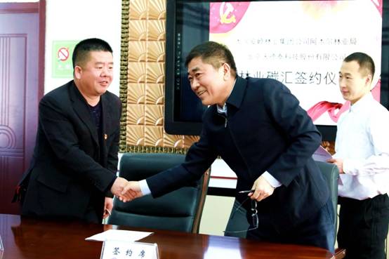 阿木爾林業(yè)局副局長李玉峰與北京天得泰科技股份有限公司副董事長、專家委員會主席孫樹鎖相互握手,慶賀簽約文本,開啟碳匯經(jīng)濟產(chǎn)業(yè)發(fā)展之路(王力 攝)