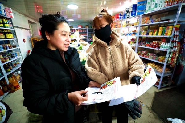 阿木爾社區(qū)志愿者王春草(左一)、李建靜(右一)深入到何忠智經(jīng)營業(yè)戶,宣傳《森林法》,增強居民法律意識(王力 攝)