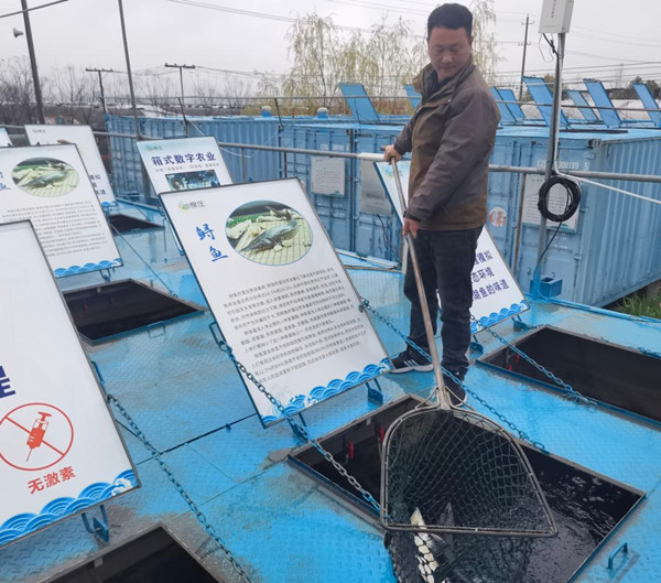 在良莊農(nóng)業(yè)科技園里,一排排藍(lán)色集裝箱,以及寫(xiě)著“養(yǎng)殖箱體全程模擬自然生態(tài)環(huán)境,還您江湖魚(yú)的味道”等字樣的標(biāo)牌,別有一番趣味。記者了解到,這里是一個(gè)智慧漁場(chǎng),裝滿(mǎn)水的集裝箱則是鱘魚(yú)、鱸魚(yú)、鯽魚(yú)等的“家園”,打開(kāi)一個(gè)集裝箱的頂部,三五成群的魚(yú)兒在約15平方米的水里游來(lái)游去。