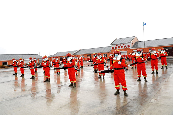 阿木爾林業(yè)局專業(yè)撲火隊(duì)員正在進(jìn)行風(fēng)力滅火機(jī)科目演練(王力 攝)