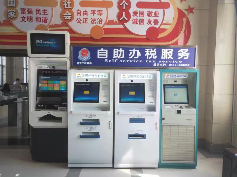 漠河市稅務局在政務服務大廳配置了3臺自助辦稅終端,分別是發(fā)票代開自助終端、發(fā)票申領自助終端和定額發(fā)票申領終端。
