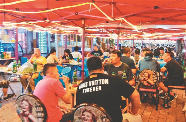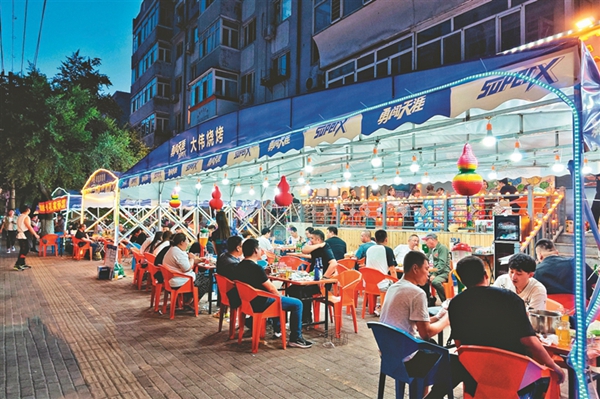 夜幕降臨,冰城街路的大排檔里,人們一邊吃著燒烤海鮮,一邊喝著啤酒,談天說地,不亦樂乎……仲夏六月,在大排檔允許外擺政策的推動下,夏日“夜經(jīng)濟(jì)”越來越火熱,冰城濃濃的“煙火氣”回歸。大排檔既豐富了市民生活,冰城的快樂消費也開始了。