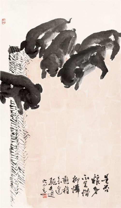湯文選的人物、山水、花鳥、墨虎等一系列作品,融會著、貫穿著“三種傳統(tǒng)”?;螂[或顯,或化解之,或凝聚之,或熔裁之,或獨造之?!叭N傳統(tǒng)”,可概括為現(xiàn)實主義在中國畫發(fā)展歷程中的三段式,亦曰交叉出現(xiàn)的不同歷史內(nèi)涵、文化反映的三種藝術(shù)狀態(tài):首先,是古代現(xiàn)實主義傳統(tǒng)——“外師造化,中得心源”。其二,是“五四”現(xiàn)實主義傳統(tǒng)——融合西法,崇尚寫實。其三,是新中國成立后倡導(dǎo)的革命現(xiàn)實主義傳統(tǒng)。深入火熱斗爭,深入工農(nóng)兵。學(xué)習(xí)延安木刻,學(xué)習(xí)民間年畫,學(xué)習(xí)蘇聯(lián)油畫現(xiàn)實主義的創(chuàng)作方法(50年代)。其后,“一手伸向生活,一手伸向傳統(tǒng)”(60年代)。在以上“三種傳統(tǒng)”的交匯點上,伸延出湯文選早期和中期的現(xiàn)實主義創(chuàng)作之路。湯文選中國畫藝術(shù)的現(xiàn)實主義,其主要特征為積極的入世態(tài)度,強(qiáng)烈的人文主義色彩,個性、民族性與時代性的完美統(tǒng)一,以及嚴(yán)肅的歷史使命感。