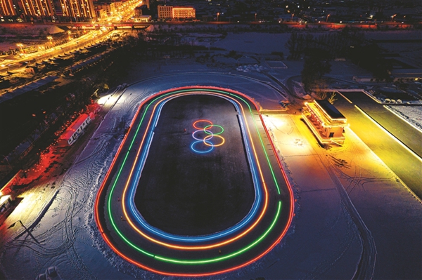 日前,雞西市橋北體育場大型燈光速滑冰場亮相并投入使用。冰場上,紅、綠、藍、黃四條光帶分隔的速滑賽道美麗且醒目。在冰場的中央,由五色光帶構(gòu)成的奧運五環(huán)標(biāo)志清晰明亮,冰場四周懸掛了1000個小燈籠。燈光錯落有致,色彩斑斕,吸引了大量市民加入到夜滑隊伍中。楊春光 本報記者 孫偉民攝