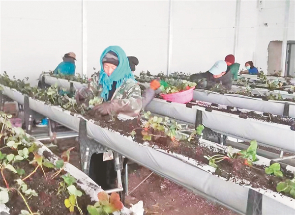 “早上7點(diǎn)去,下午4點(diǎn)多就收工回來了,離家近,每天能賺150元,挺好的?!睆埥鹣阏f。走進(jìn)產(chǎn)業(yè)園的草莓溫室大棚,如張金香一般來自谷大村的女工們正認(rèn)真地進(jìn)行著手中的工作。移栽、覆膜、澆水……14萬株蘊(yùn)含著期待與希望的草莓秧苗正在茁壯成長。