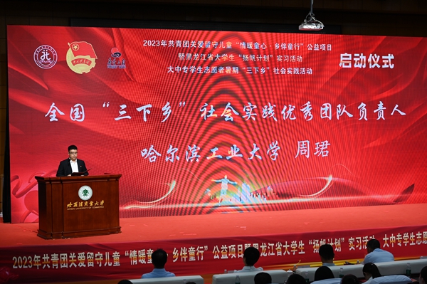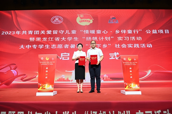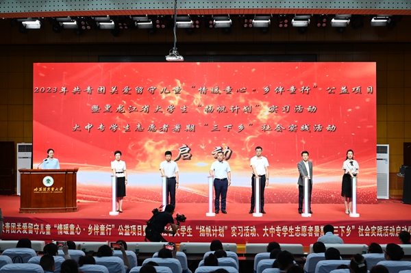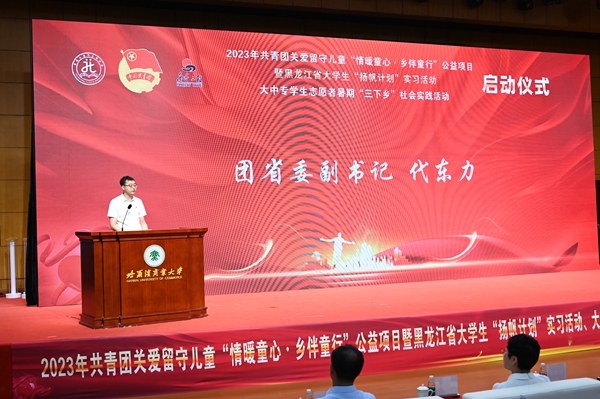 本次活動,在哈爾濱商業(yè)大學(xué)的大力支持下順利開展,哈爾濱商業(yè)大學(xué)副校長姜國鋒在儀式上致辭,他說:“學(xué)校建校71年來,立足立德樹人根本任務(wù),聚焦‘為黨育人,為國育才’的職責(zé)使命,在不斷加強‘第一課堂’建設(shè)的同時,還依托學(xué)?!惑w兩翼’文化育人模式,充分發(fā)揮實踐育人的作用,通過開展‘三下鄉(xiāng)’‘返家鄉(xiāng)’等社會實踐和‘西部計劃’‘興邊富民’志愿服務(wù)項目,引導(dǎo)廣大青年學(xué)生堅持用習(xí)近平新時代中國特色社會主義思想凝心鑄魂,在社會的課堂中‘受教育、長才干、作貢獻’?!被顒蝇F(xiàn)場,播放《黑龍江省希望工程30年與光同行》和黑龍江省大中專學(xué)生志愿者暑期“三下鄉(xiāng)”社會實踐活動宣傳片,與會領(lǐng)導(dǎo)上臺共同啟動了“情暖童心·鄉(xiāng)伴童行”公益項目、大學(xué)生“揚帆計劃”實習(xí)活動、大中專學(xué)生志愿者暑期“三下鄉(xiāng)”社會實踐活動。