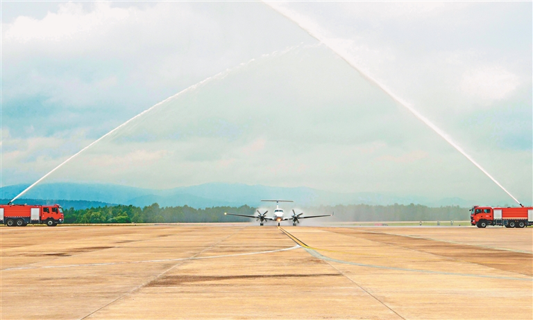 伴隨著飛機(jī)的轟鳴聲,命名為“林都號(hào)”的國(guó)王350飛機(jī)平穩(wěn)降落林都伊春,緩緩駛向林都機(jī)場(chǎng)5號(hào)停機(jī)坪。當(dāng)飛機(jī)落地脫離跑道后,左右兩側(cè)的消防車開始噴射水霧,兩束水霧相互交錯(cuò),以“水門禮”熱烈歡迎乘坐“林都號(hào)”來(lái)伊春的游客。