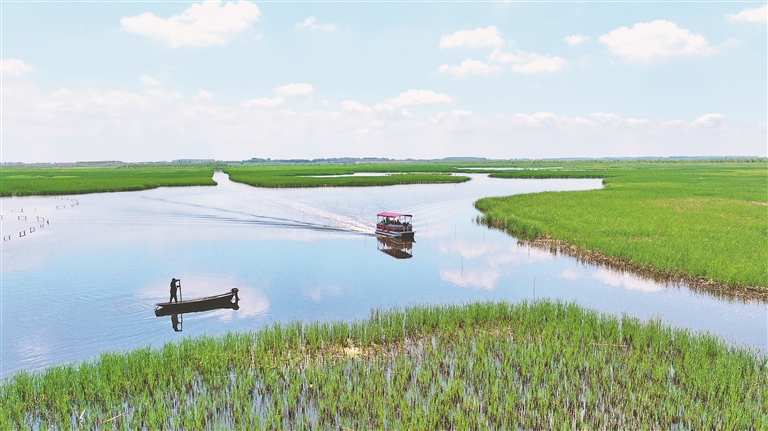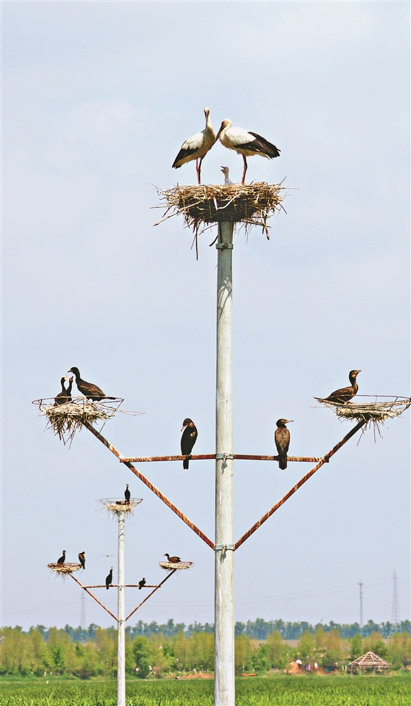 作為松花江流域保存完整、濕地多樣性特征顯著的天然遺跡,千鶴島濕地水草茂盛,魚類繁多,成為鳥類繁衍生息的天然場所。據(jù)風(fēng)景區(qū)工作人員介紹,由于濕地內(nèi)植被資源保護(hù)完好,每年都吸引大量候鳥來此繁衍生活,且數(shù)量逐年增加。特別是今年搭建38個(gè)人工鳥巢后,濕地內(nèi)的東方白鸛數(shù)量達(dá)到300余只,成為國內(nèi)數(shù)量最多的棲息種群。