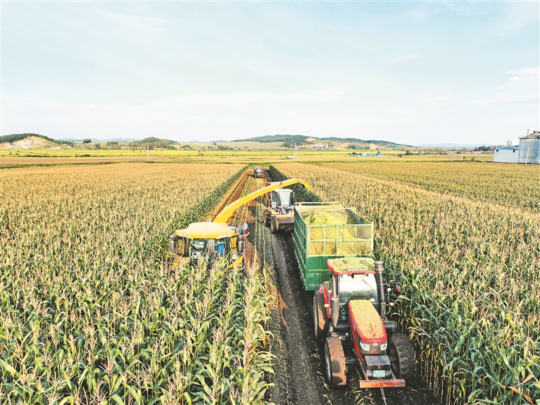 青貯玉米是八五一一農(nóng)場(chǎng)有限公司2.4萬(wàn)頭奶牛越冬的重要口糧。經(jīng)過(guò)切碎、加工后,發(fā)酵制作成青貯飼料的玉米干物質(zhì)淀粉含量高、營(yíng)養(yǎng)好,是公認(rèn)的優(yōu)質(zhì)飼料。青貯玉米既為奶牛提供了優(yōu)質(zhì)口糧,又減少了因焚燒玉米秸稈帶來(lái)的環(huán)境污染,為各牧場(chǎng)增收奠定了基礎(chǔ),更實(shí)現(xiàn)了畜牧業(yè)綠色低碳高質(zhì)量發(fā)展。