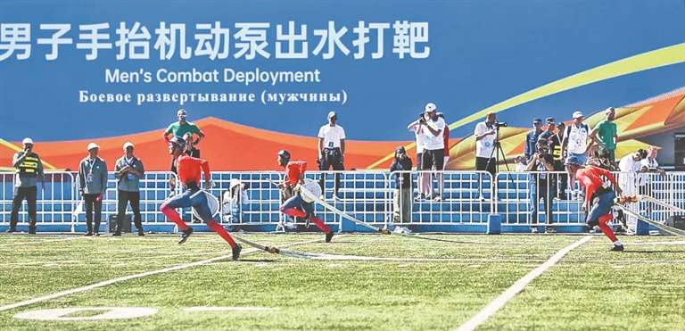 手抬機(jī)動(dòng)泵出水打靶比賽為團(tuán)體項(xiàng)目,由7名運(yùn)動(dòng)員組隊(duì)參賽,需要運(yùn)動(dòng)員通力協(xié)同,首先快速啟動(dòng)水泵,同步連接吸水管、濾水器等進(jìn)行吸水供水,然后沿水泵與標(biāo)靶之間,依次完成3盤(pán)干線(xiàn)水帶、1個(gè)分水器、4盤(pán)支線(xiàn)水帶的連接任務(wù),最后2名水槍手連接水槍?zhuān)蜃松渌?,直擊靶心。?dāng)注水達(dá)10升時(shí),指示燈閃爍,停止計(jì)時(shí),完成比賽。