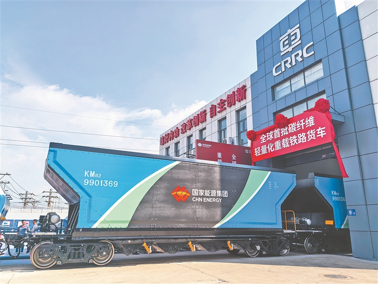 中車齊車集團(tuán)齊車公司首批碳纖維復(fù)合材料輕量化重載鐵路貨車駛出生產(chǎn)線。張雲(yún)淞攝