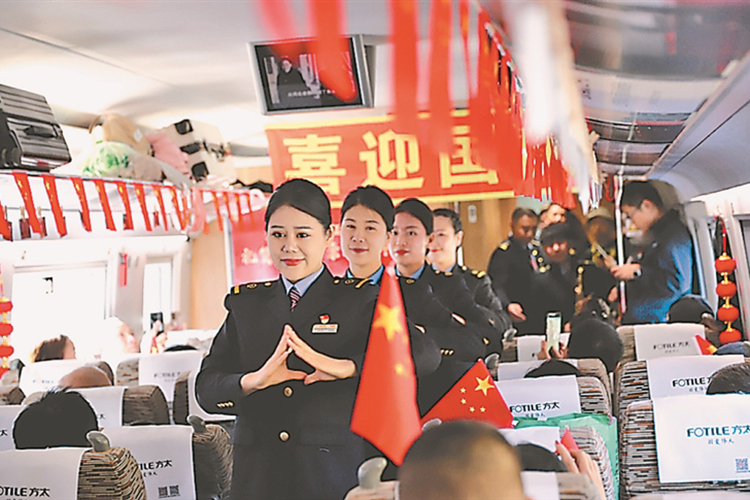 G774次列車乘務人員與乘客一起聯(lián)歡。本報記者 王迪攝