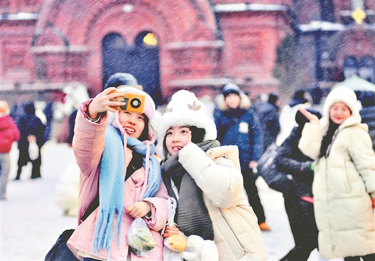 在各處景點,降雪讓游客們游玩興致更濃,大家紛紛在雪中拍照,記錄下精彩瞬間,感受降雪帶來的快樂。
