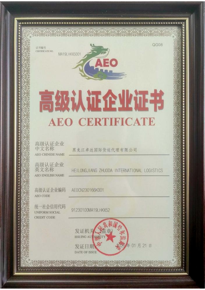 圖1黑龍江卓達(dá)國(guó)際貨運(yùn)代理有限公司AEO認(rèn)證證書(shū)