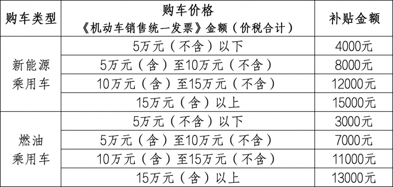 細則規(guī)定,消費者轉(zhuǎn)讓的舊車應于2025年1月8日前登記在申請人名下。在購買新車時,按照《機動車銷售統(tǒng)一發(fā)票》金額(價稅合計),置換車輛為新能源乘用車新車的:5萬元(不含)以下每輛補貼4000元;5(含)-10萬元(不含)補貼8000元;10(含)-15萬元(不含)補貼12000元;15萬元(含)以上補貼15000元。如置換燃油乘用車:5萬元(不含)以下補貼3000元;5(含)-10萬元(不含)補貼7000元;10(含)-15萬元(不含)補貼 11000元;15萬元(含)以上補貼13000元。補貼資金用完活動即止。