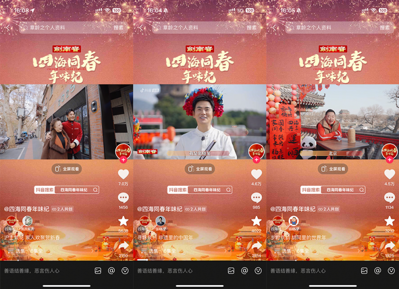 為紀(jì)念首個(gè)“非遺版春節(jié)”,由抖音出品、中國(guó)名酒劍南春冠名的春節(jié)主題紀(jì)錄片《四海同春年味紀(jì)》邀請(qǐng)多位明星來(lái)到家鄉(xiāng)或向往的城市,體驗(yàn)當(dāng)?shù)靥厣晡?。紀(jì)錄片于1月22日-1月27日,通過(guò)抖音、抖音精選、今日頭條、西瓜視頻、鮮時(shí)光等平臺(tái)播出。截至收官,該片正片播放量超1億,抖音話題播放量破2.3億,全網(wǎng)曝光達(dá)10億,相關(guān)話題多次登上平臺(tái)熱榜。