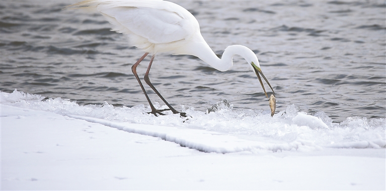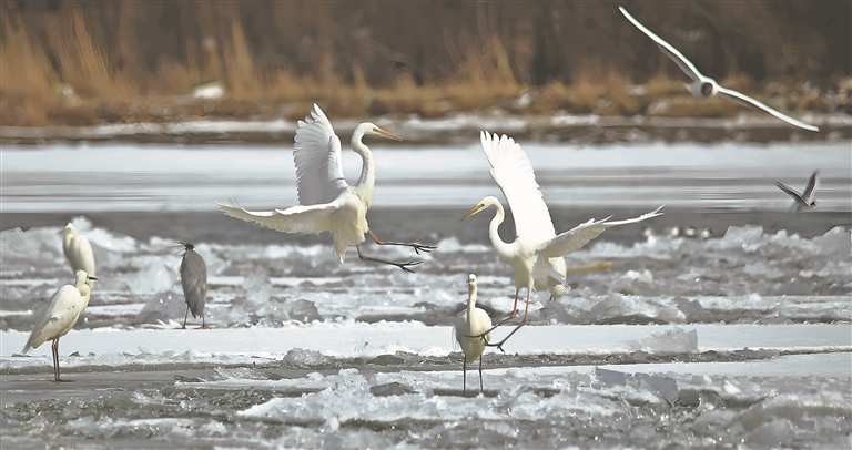 冰排流動,數(shù)百只鷺鳥羽翅翻飛,鳴聲陣陣,此時的松花江一派生機(jī)勃勃的景象。