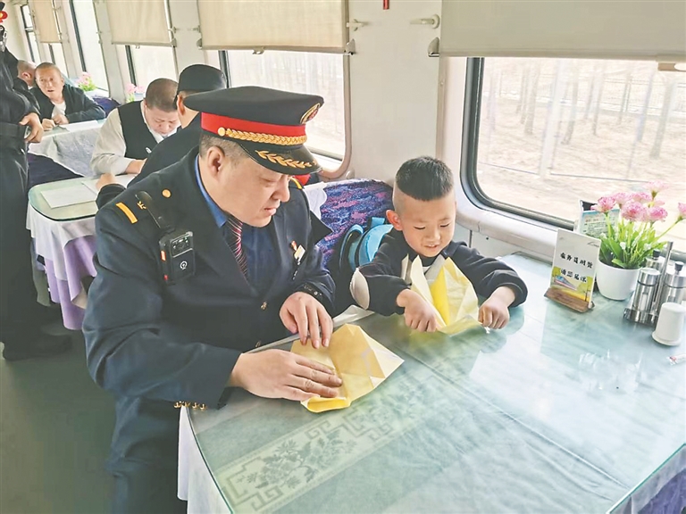 本報訊(張蔚萌 王夢 記者 王迪)近日,由鄭州開往海拉爾的K927次列車從昌圖站駛出后,列車長孫志強接到12306轉(zhuǎn)發(fā)的緊急尋人求助工單。經(jīng)過與客服溝通了解后得知,旅客劉玲玲帶6歲兒子劉俊澤從沈陽北站乘車至昌圖站,因下車時忙于整理行李,將座位上熟睡的孩子遺落在列車上。列車長孫志強通過對講機立即組織各節(jié)車廂列車員尋找孩子,確定孩子位置后迅速趕到現(xiàn)場。為了緩解孩子的緊張情緒,他化身“臨時爸爸”,將孩子帶到了餐車,不僅準(zhǔn)備了一些自帶的小零食,還陪孩子一起折紙飛機。當(dāng)列車??块L春站后,孫志強按照其母親劉玲玲的要求,將孩子安全移交給長春站工作人員,等待其家屬前來接領(lǐng)。